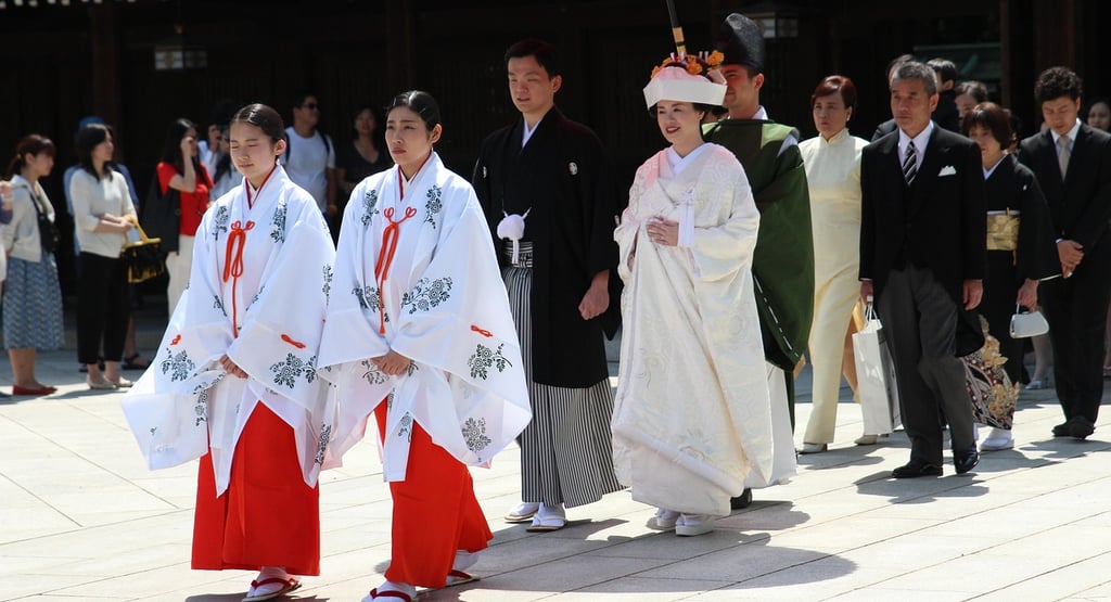 Key rituals include San-San-Kudo, where the bride and groom take three sips of sake from three cups, symbolizing union, fidelity, and family harmony. The exchange of rings and the presentation of gifts between families solidify both marital and social bonds. Brides often wear a shiromuku, an all-white kimono representing purity and the ability to adapt to the groom’s family, while grooms wear formal montsuki attire.